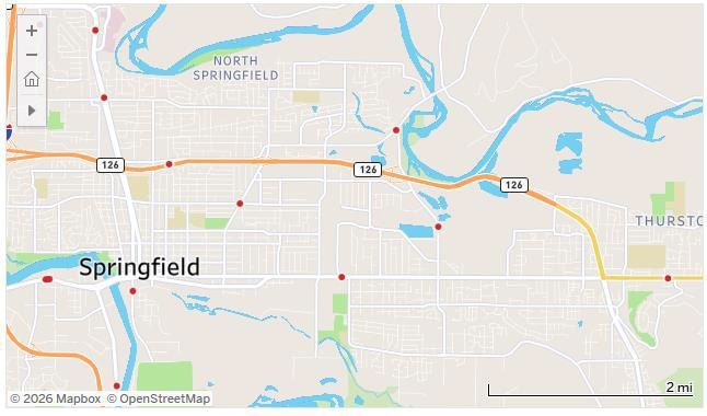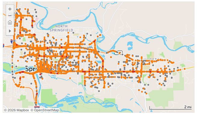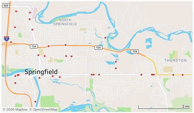 This may seem like another silly thing where the DMV requires you to fill out forms that fall into an endless bureaucracy stored in some computer somewhere, but in my opinion these are actually important. These reports allow for a large amount of data to be aggregated and evaluated over a period of time to identify dangerous stretches of road. Oregon, for example, houses their data here in a searchable database which maps the data. This crash data is compiled from Oregon DMV accident reports and police reports submitted statewide. If I control for Springfield, Oregon I get: